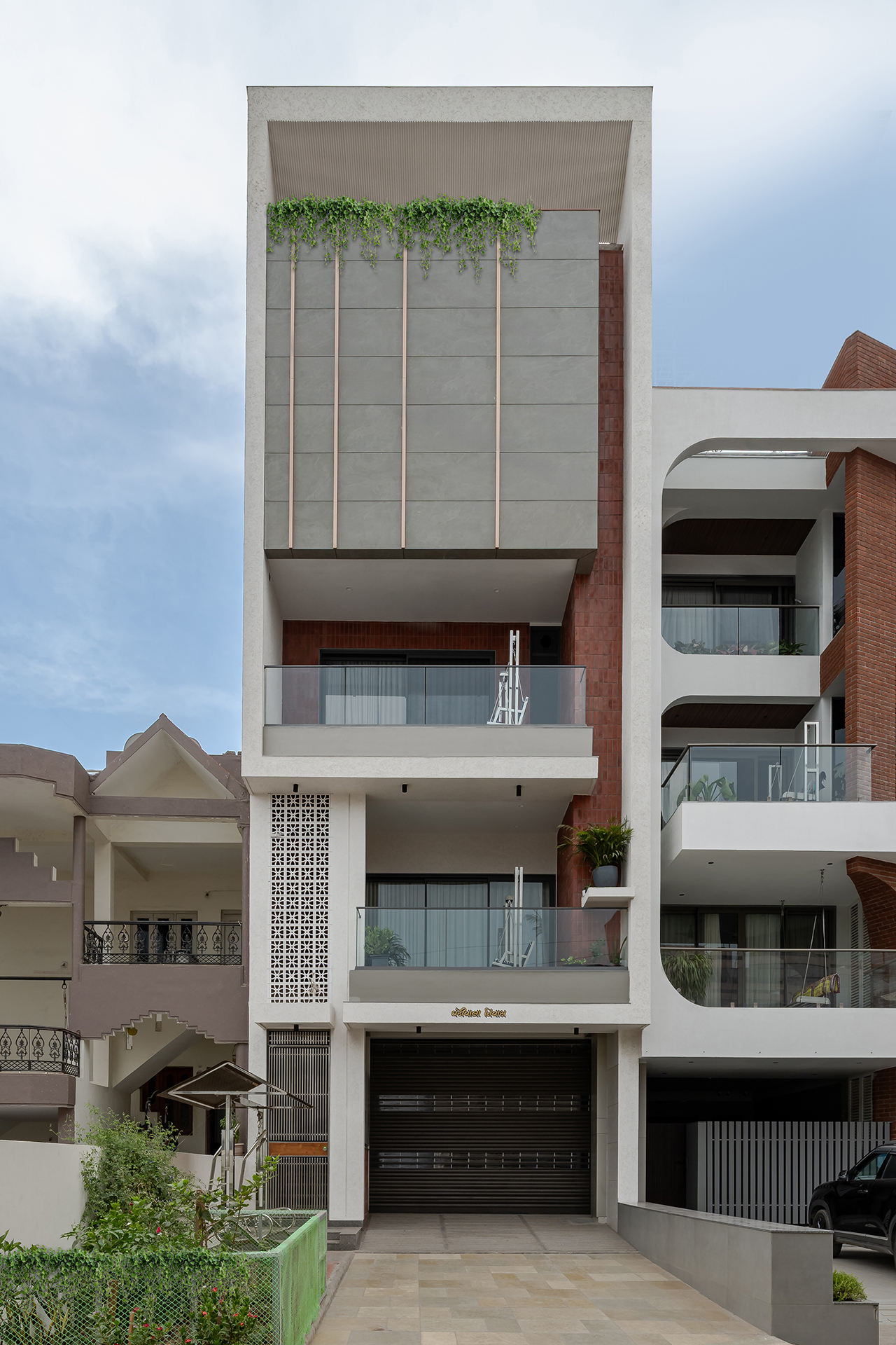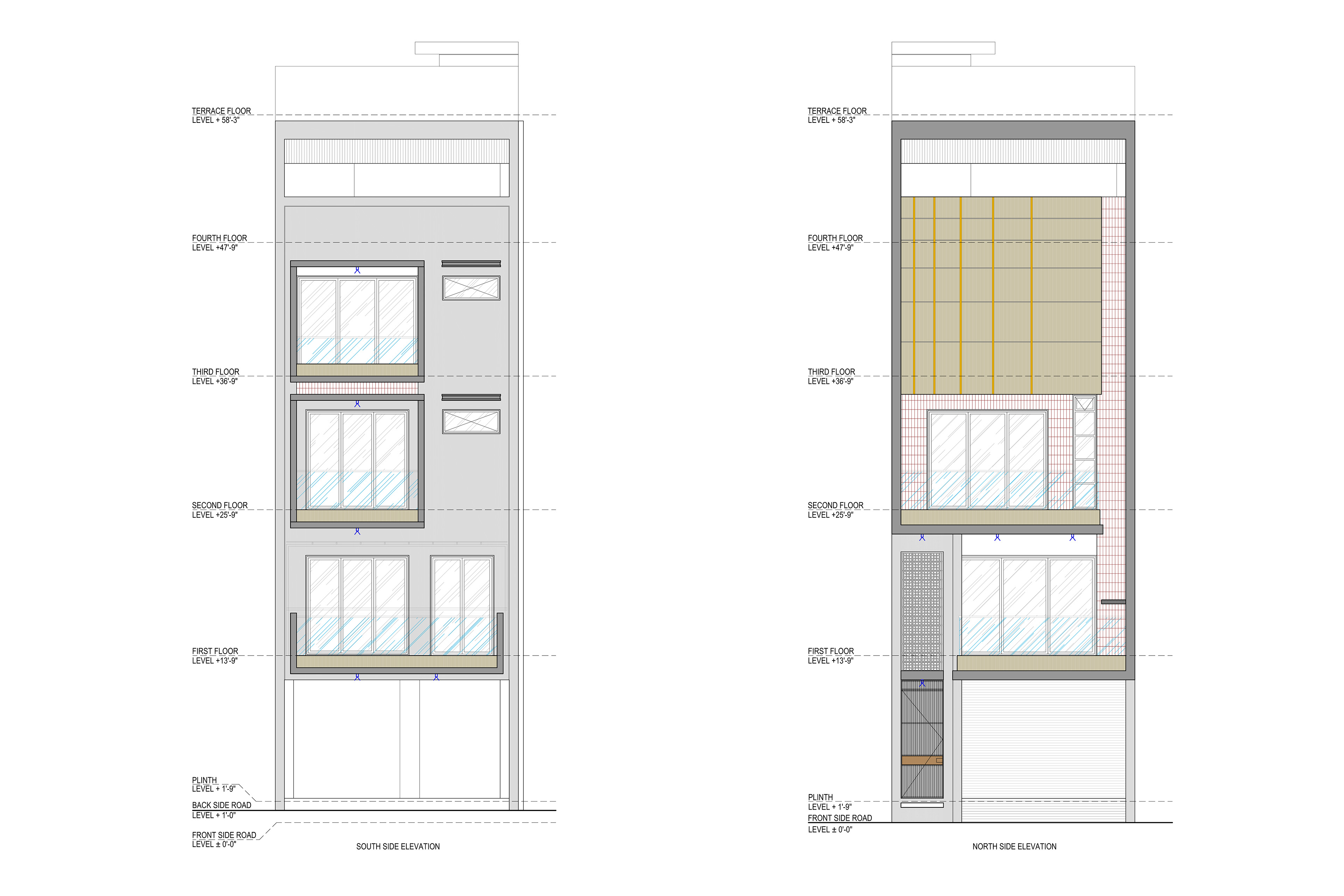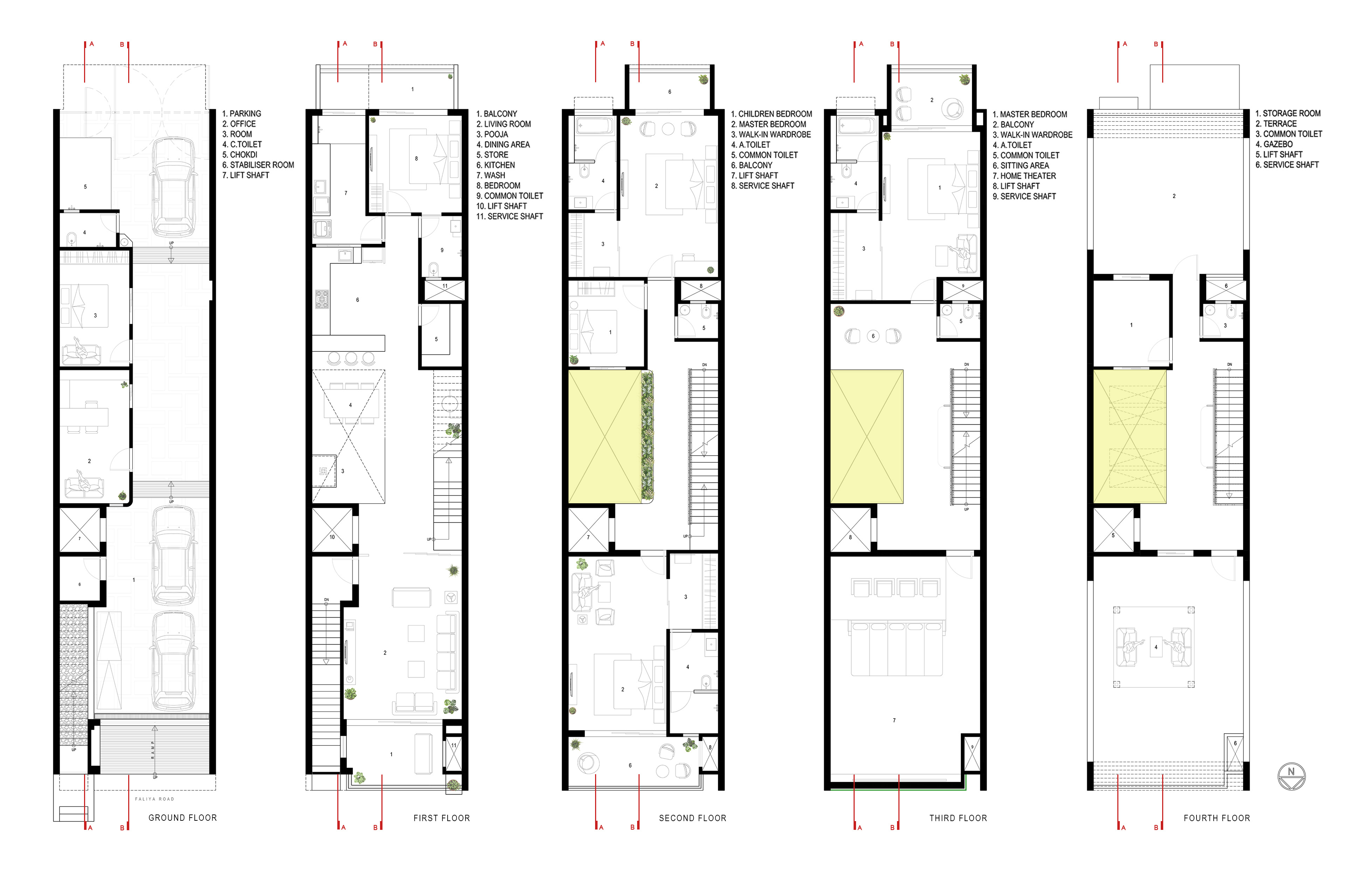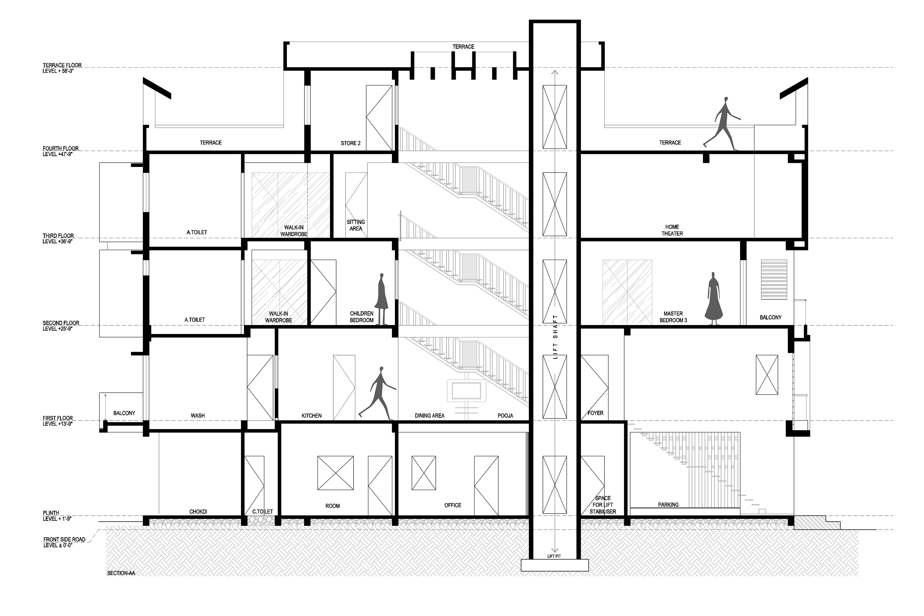 This project involved designing a home for a joint family of seven on a 20’ x 160’ plot, with an 80’ x 20’ area for the residence and the remaining space for farming equipment storage. The house shares walls on the longer east and west sides, with an approach road on the north –front side and on the south-rear side. The ground floor accommodates utility spaces, including parking, an office, and a passage to the rear to stay connected from the rear side approach road.