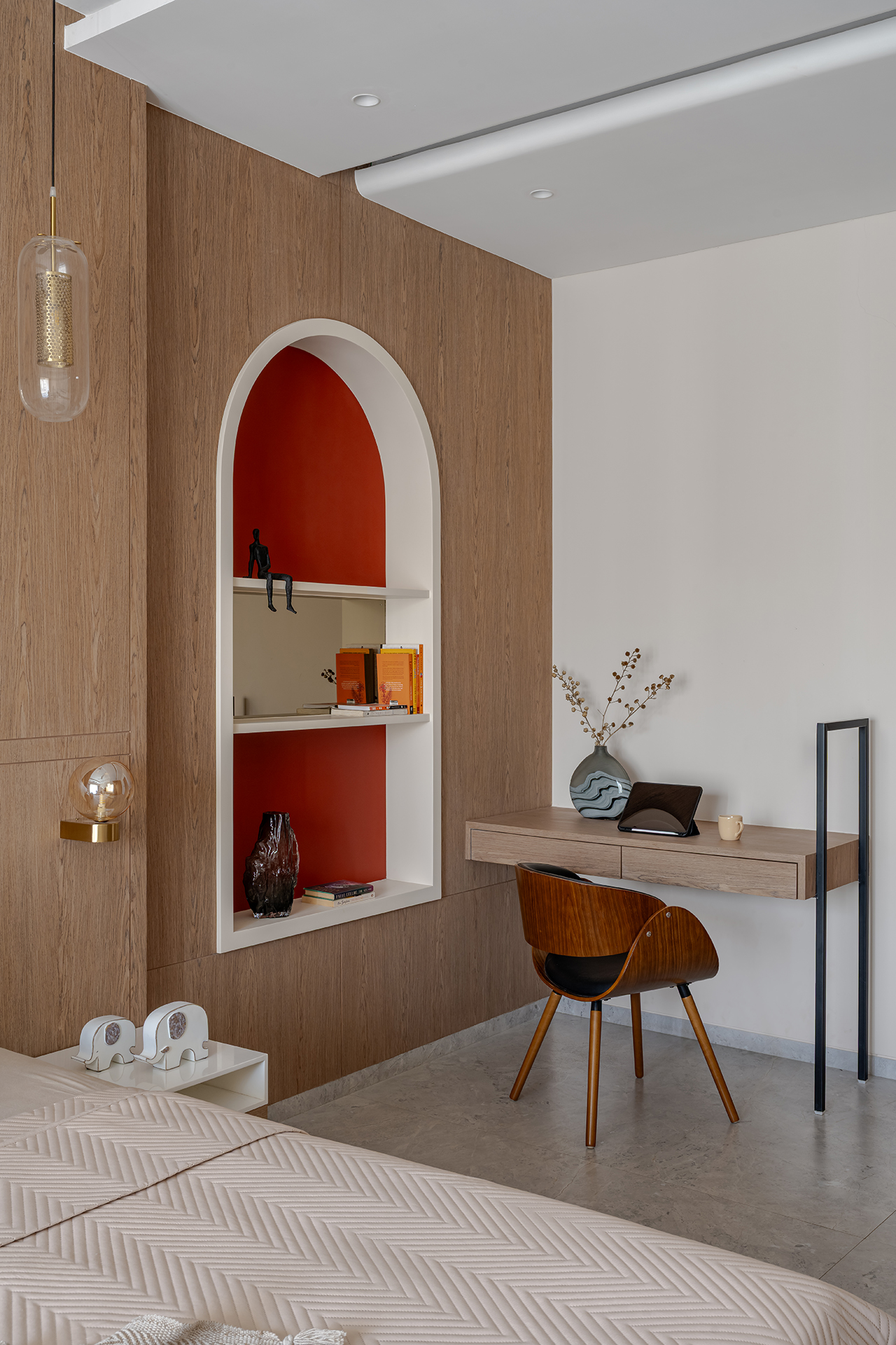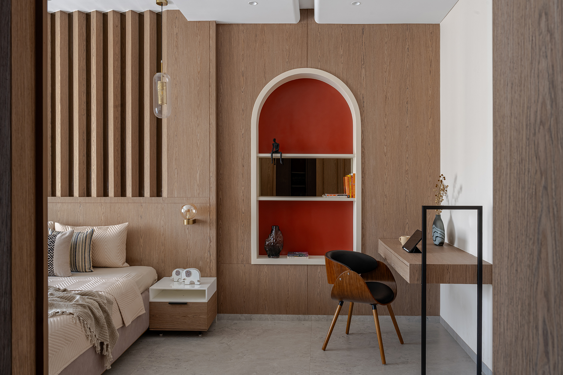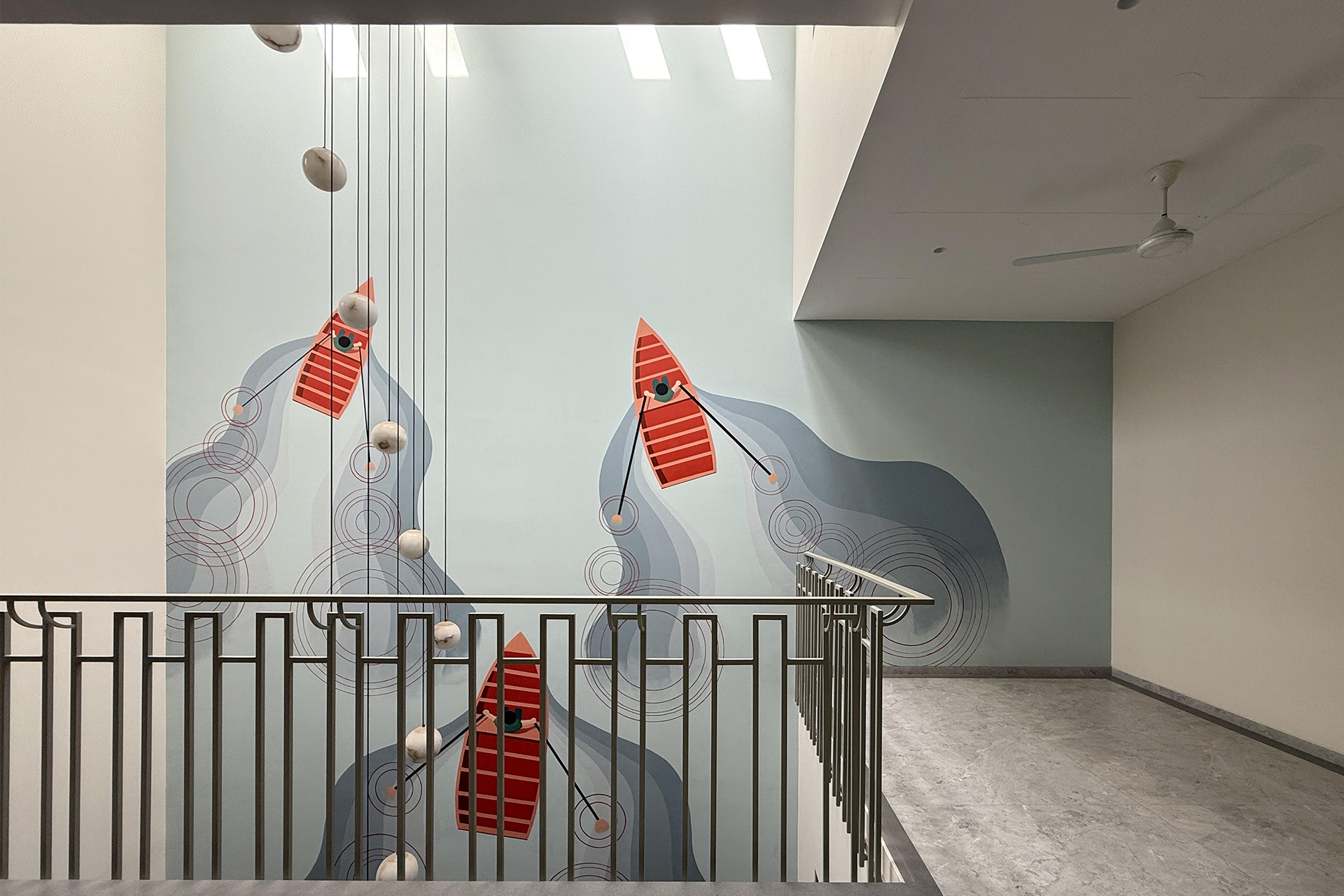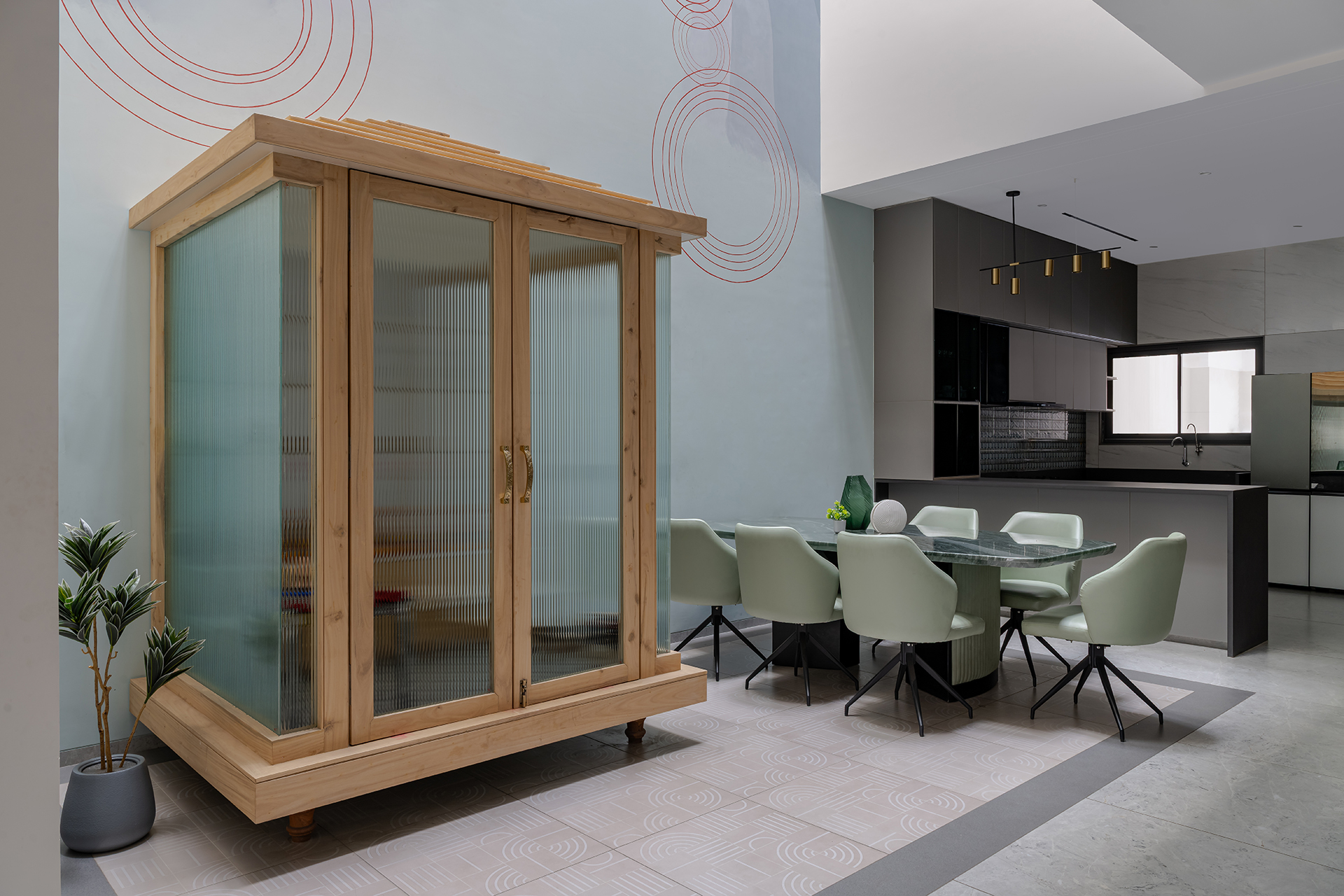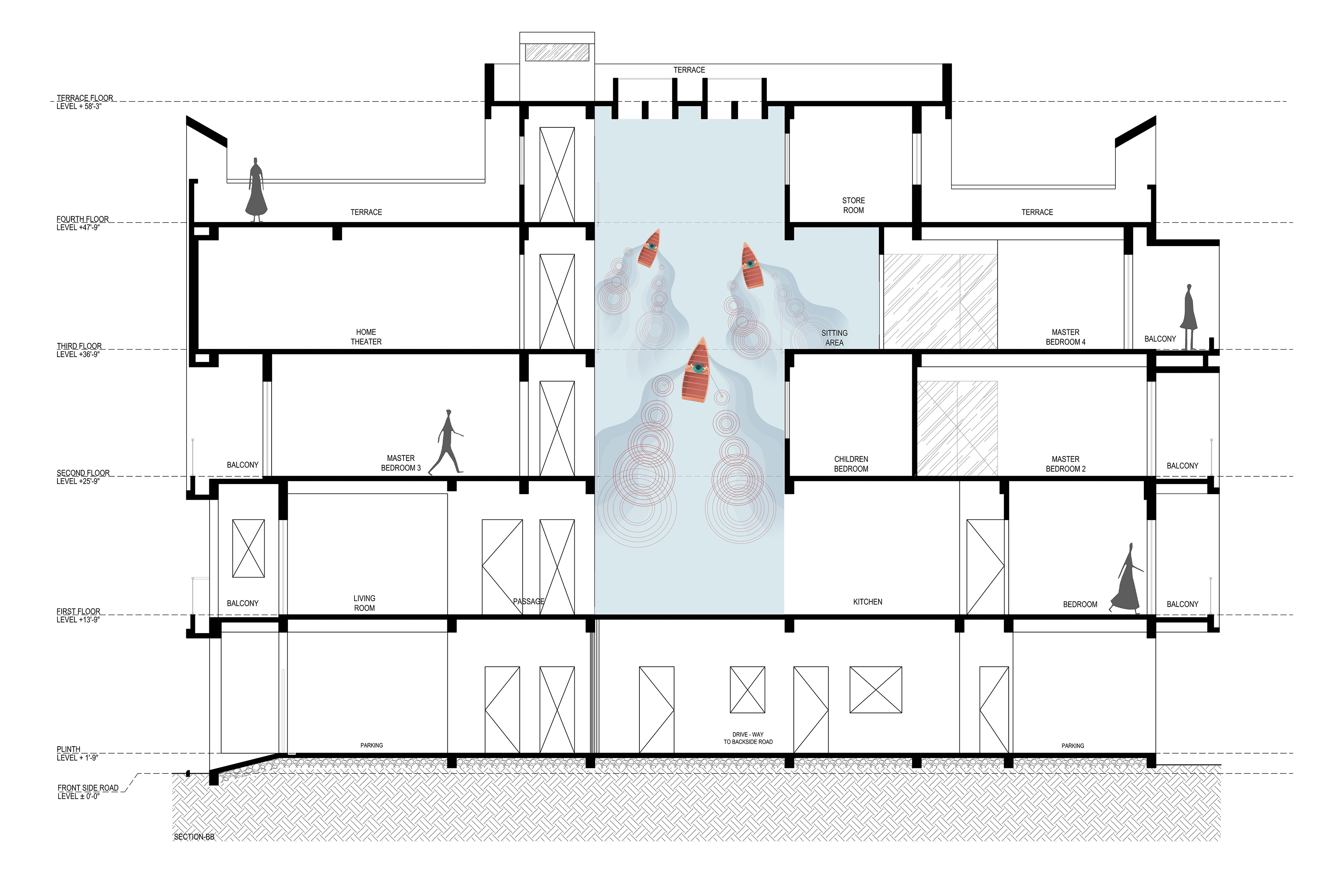 This project involved designing a home for a joint family of seven on a 20’ x 160’ plot, with an 80’ x 20’ area for the residence and the remaining space for farming equipment storage. The house shares walls on the longer east and west sides, with an approach road on the north –front side and on the south-rear side. The ground floor accommodates utility spaces, including parking, an office, and a passage to the rear to stay connected from the rear side approach road.