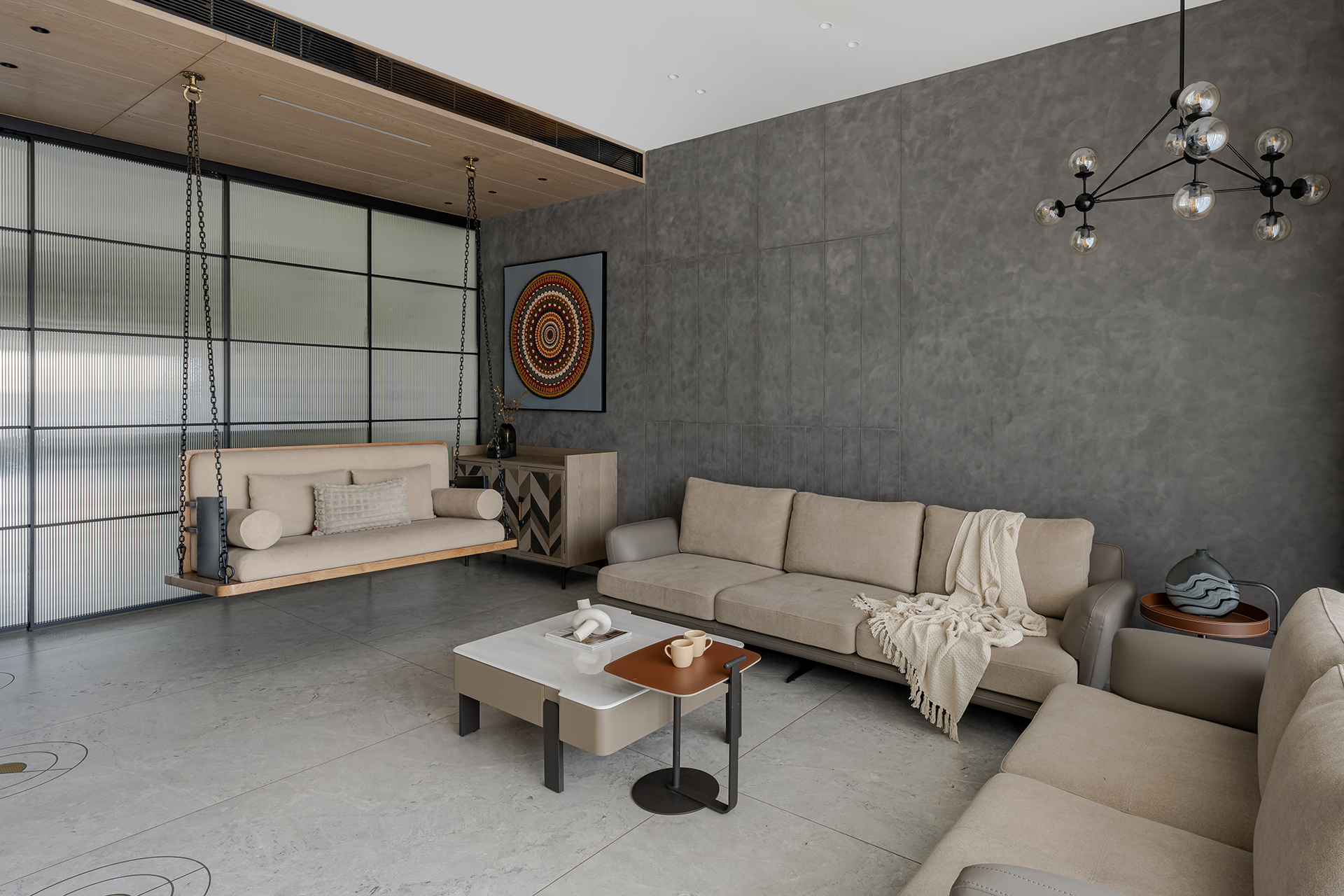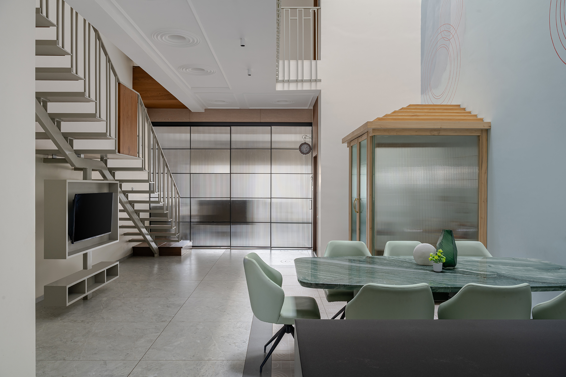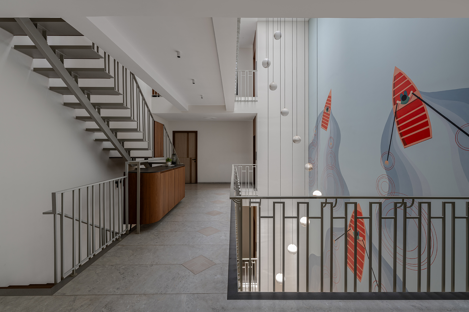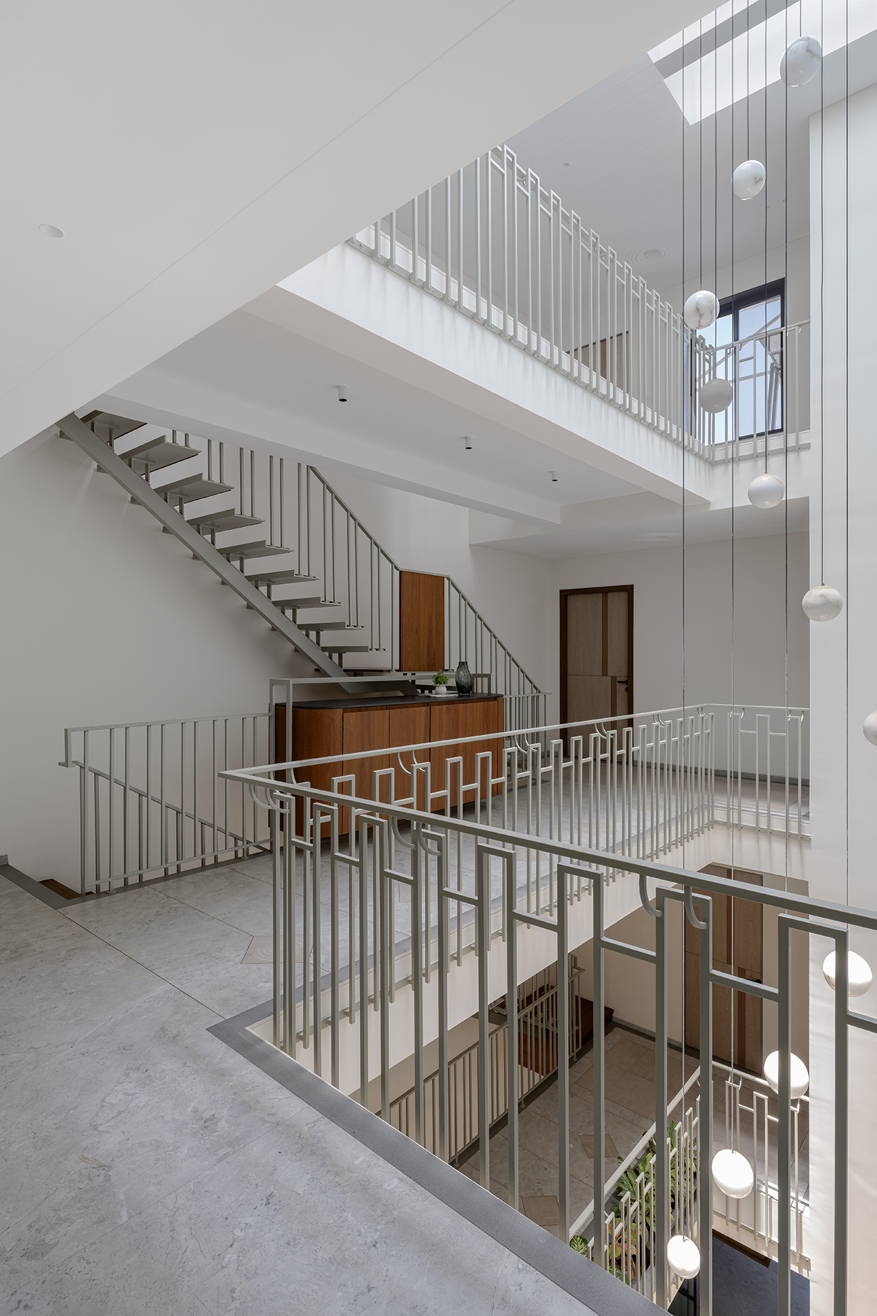 The north-facing façade maximizes street views and natural light with large openings and balconies. A central triple-height atrium with a skylight illuminates the interior, while rear balconies minimize direct sunlight, ensuring a bright, comfortable living environment.
